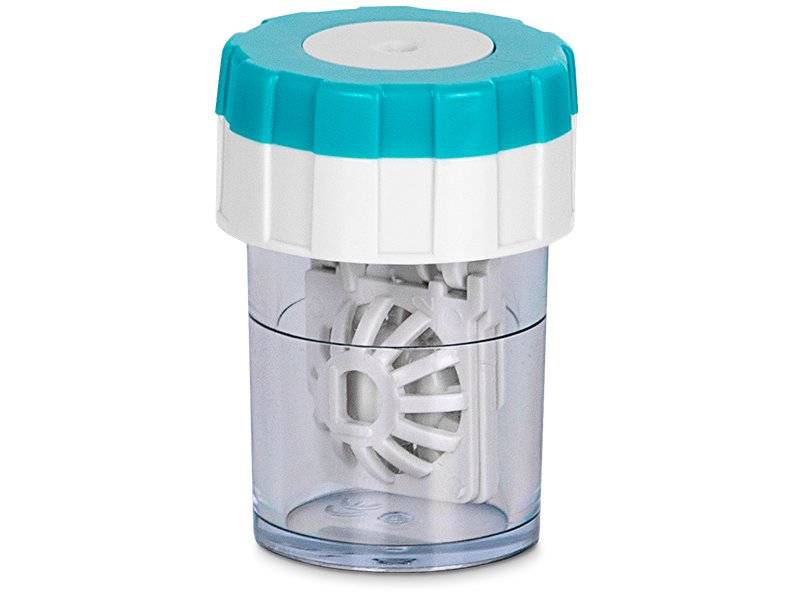 Após colocar as lentes no estojo com rosca rode a tampa para a direita várias vezes. Rodar a tampa faz os cestos no interior rodar também, garantindo assim melhores resultados de limpeza. Após desinfetar, volte a encher o estojo com solução fresca e enxague as lentes rodando os cestos.